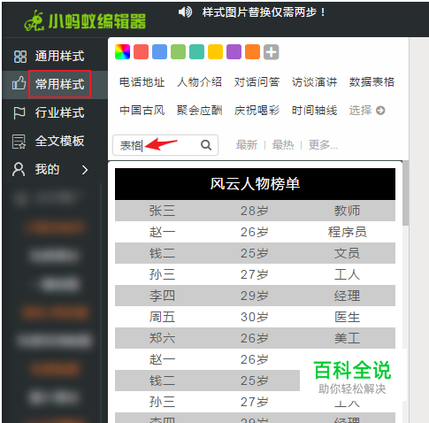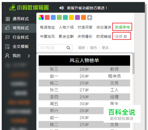 点击“常用样式”分类,选择“数据表格”;或在“常用样式”类目下直接搜索“表格”,更多分类可以点击最后一个【选择】按钮进行查看。