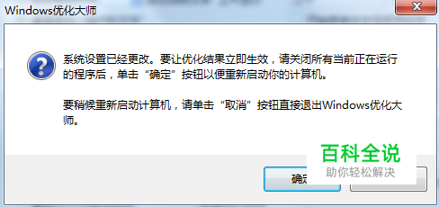 设置完成后,关闭优化大师,这时提醒需要重启电脑更改才会生效,点击确定按钮。