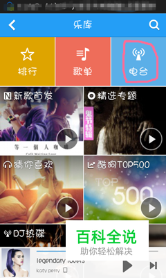 首先,在手机上下载酷狗音乐,下载完毕,打开酷狗音乐。找到“乐库”,打开乐库。打开乐库,你就会看到“排行”“歌单”“电台”,点击进入电台,在全部。