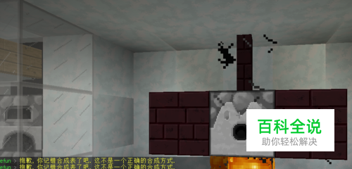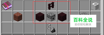 建造 在离地一格高的地方放一个发射器,发射器的两侧各放一个地狱砖块,然后在发射器上插一个地狱砖栅栏。图例打火石的意思是“在发射器下方点火”,只有当燃着火焰时冶炼厂才算成型,不过这里暂时不理,我们先把外形做出来。