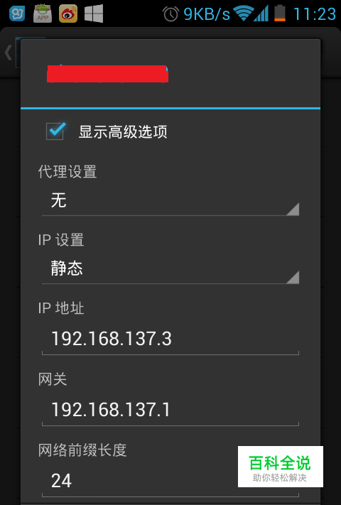 步骤1中提到的ip假如是192.168.137.1 子网掩码为255.255.255.0 (一般装好wifiadapter驱动后就默认设置好的)就把手机ip设为192.168.137.2,子网掩码255.255.255.0,默认网关:192.168.137.1,DNS1:192.168.137.1(也可填写默认设置8.8.8.8)。DNS2可不填。