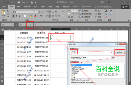 第一步打开表格,选中显示分钟数的单元格,选中函数 fx按钮,在弹出的提示框中输入函数: TEXT → 转到 → 确定; 如图所示: