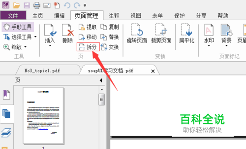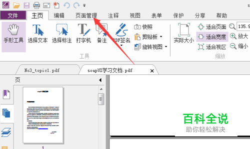进行使用pdf的软件进行打开一个pdf文档的文件,打开完成之后,进行点击菜单中的“页面管理”的选项。