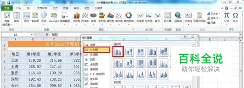 在工作表中输入数据,选择如图的单元格区域A3:E7.在“插入”选项卡的“图表”中,单击某一图表类型。