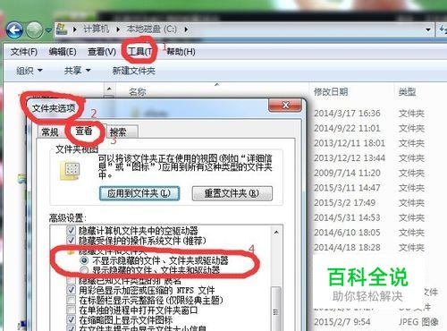 打开c盘,选择工具,文件夹选项,查看,选择显示隐藏文件