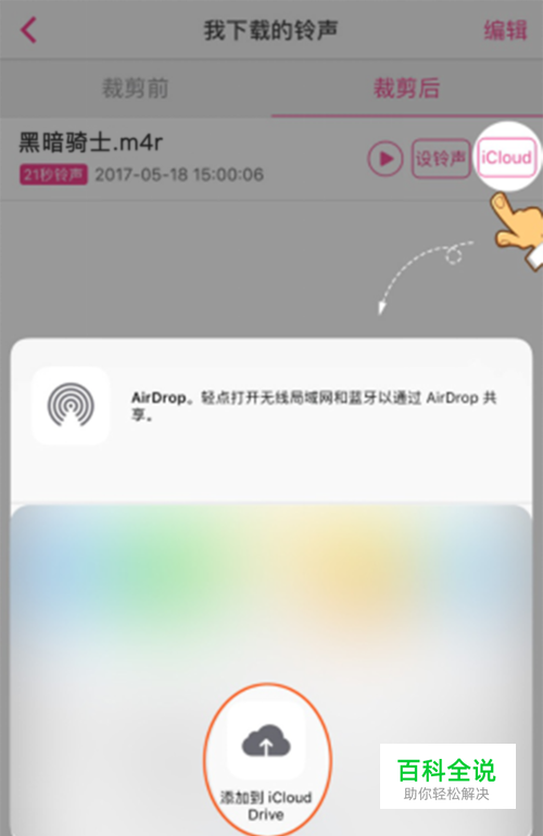 打开【酷音铃声】找到「我的」→「下载/铃声」→「裁剪后」,点击「iCloud」选择「添加到iCloud Drive」,铃声就存至iCloud Drive啦