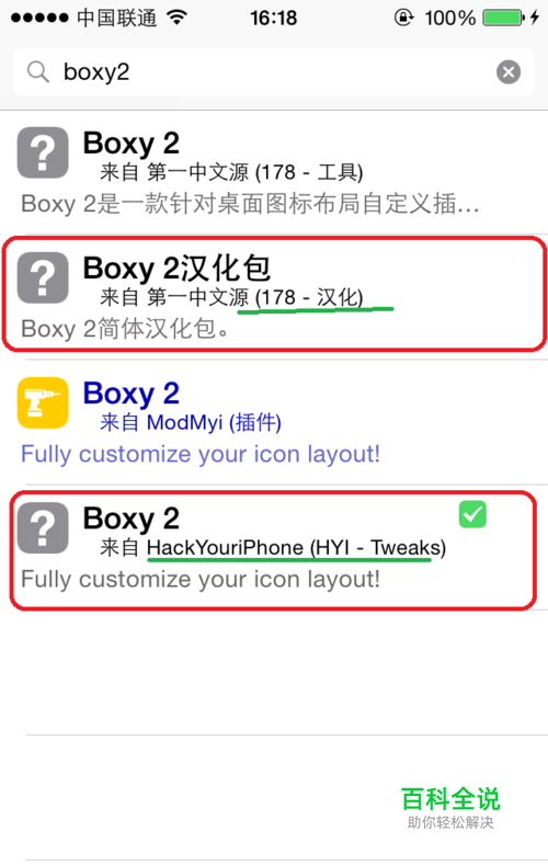 在cydia检索“boxy2”,如图,下载“hankyouriphone”源的boxy2,然后下载178源的汉化包。