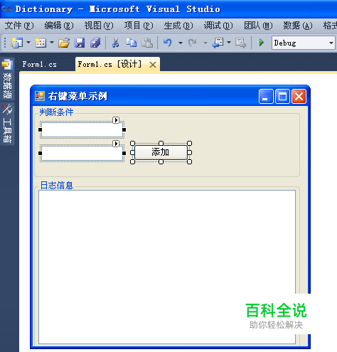 在文本框[tbxLog]的属性【contextMenuStrip】中选择新增的右键菜单控件[contextMenuStrip1].