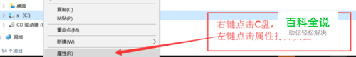 win10的话,得在左侧找到那个我的电脑, 我的盘只有C盘一个盘,其他的可能分区了, 但是差不多,只要找到C盘就好啦, 右键点击C盘,找到属性,左键点击属性打开win10的属性的页面