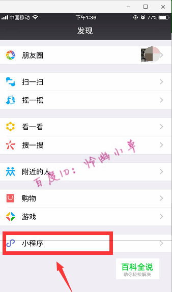 打开微信,选择“发现”→“小程序”。
