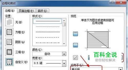打开“边框和底纹”对话框,在“预览”栏中选择“斜线”,在“应用于”下拉列表中选择“单元格”选项,单击“确定”按钮,如图所示。