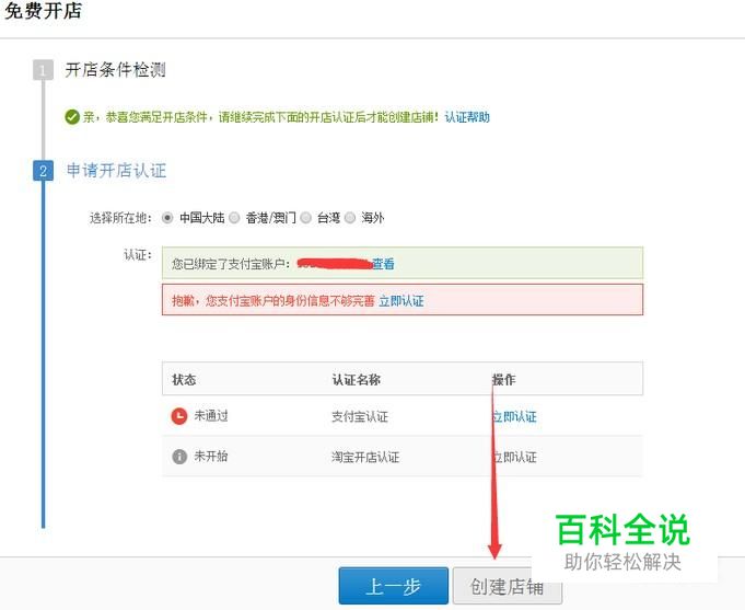 根据要求绑定好支付宝并完善身份信息,点击创建店铺