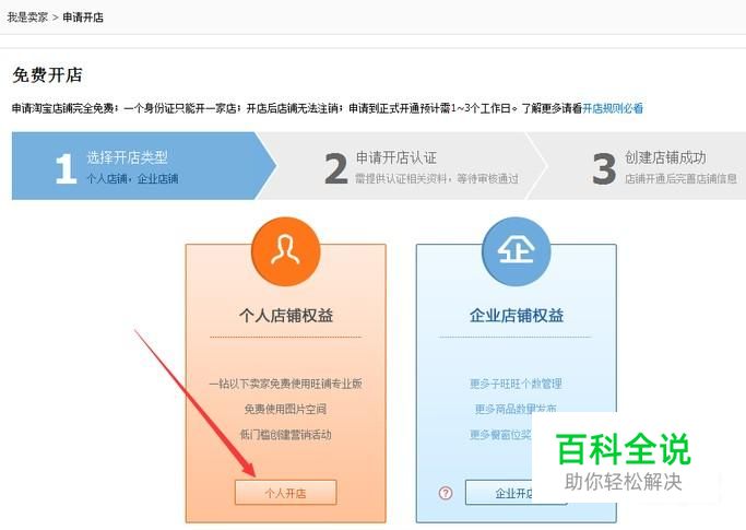 登录已有的淘宝账号后,就会进入到免费开店的页面,选择个人开店