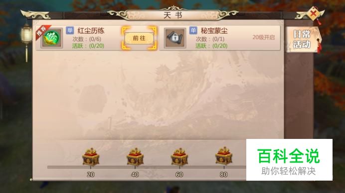 完成20次会获得20点活跃,在天书界面的下方点击相应的活跃宝箱即可领取相关奖励。