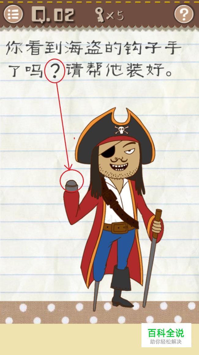 第二关要我们寻找海盗的钩子,钩子看似没有,不过这不是有个“?”号吗,我们拖动它到海盗的手上形成钩子就成了。