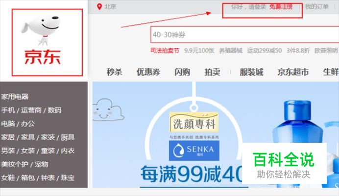 电脑搜索并进入京东官网,点击网页上方的“登录”按钮,进入个人帐号。若没有账号的话需先点击“注册”进行申请。