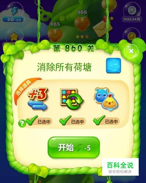 首先选择开心消消乐的860关,并选择自己需要的道具,想快速过关这是不可缺少的。这关主要的任务是消除所有的荷塘,这不是一般的难缠,因为这荷塘会蔓延并长出荷叶,这就很难去除了。