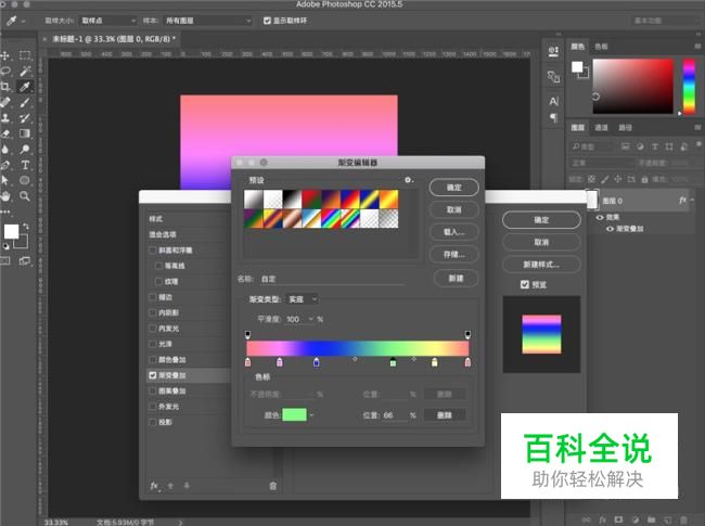 进入图层样式界面,添加一个渐变,渐变色越多效果就会更明显。