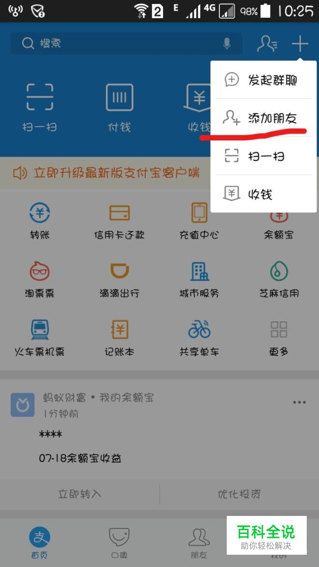 首先打开支付宝APP,登录自己的账号之后,点击主界面右上角的“+”,选择下面的添加朋友。