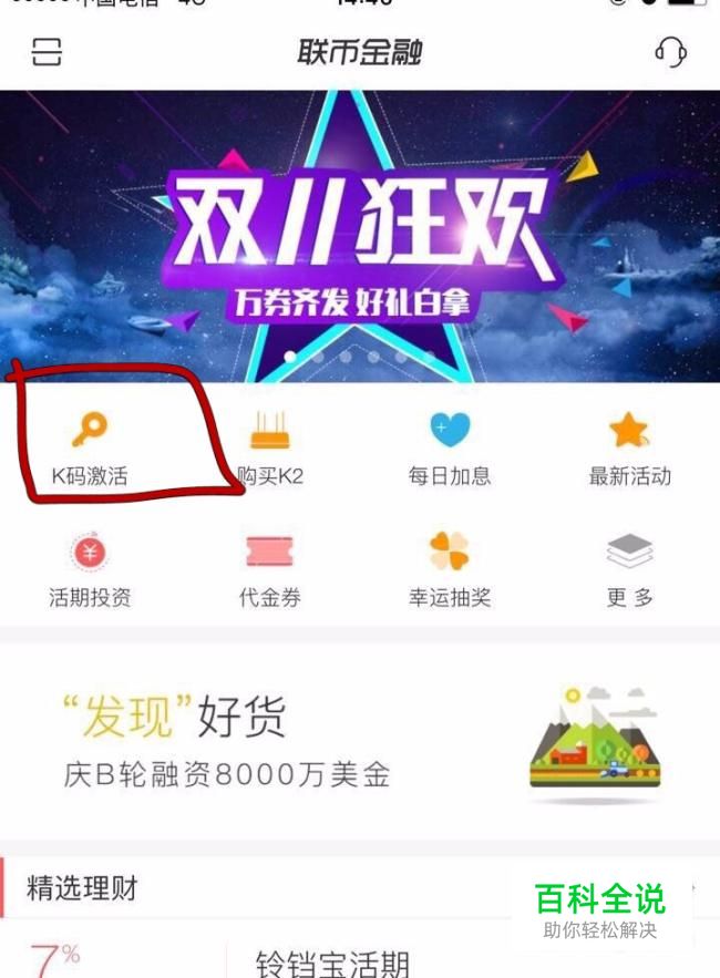 手机下载联币金融app,手机注册并登录到主页面,点击主页面k码激活