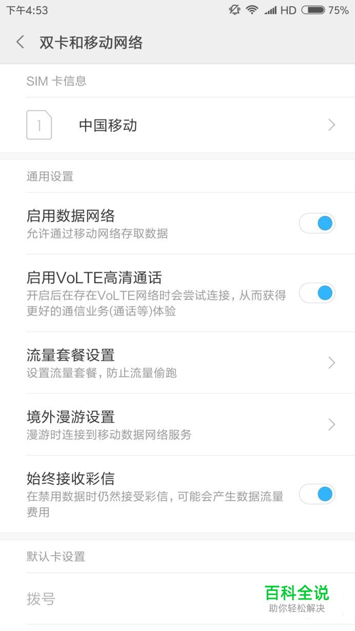 点击其右侧的按钮,将其关闭(按钮变成灰色)即可。 关闭之后,你就会发现手机屏幕上的HD图标已经消失不见了。