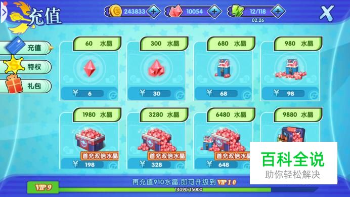 在充值页面中可以用人民币直接换取钻石,比例为1:10,首次充值还可以获得双倍水晶奖励。