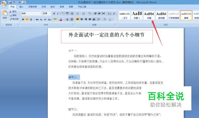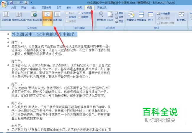 接着就是点击视图,选择大纲视图,由于大纲视图中有1-9等级之分,我们可以将“外企面试中一定注意的八个小细节”设置为1级,“细节一”可设置为2级