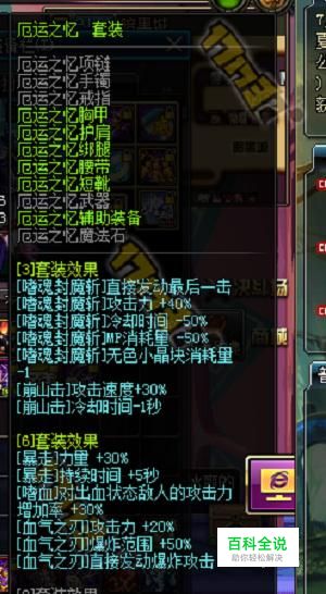 厄运之忆:3件套: [嗜魂封魔斩]直接发动最后一击 [嗜魂封魔斩]攻击力 +40%,冷却时间 -50%,MP消耗量 -50%,无色小晶块消耗量 -1。 6件套: 暴走]力量 +30%,持续时间 +5秒。 [嗜血]对出血单位伤害增加+30%。 [血气之刃]释放后立即爆炸,攻击力+20% ,爆炸范围+50%。