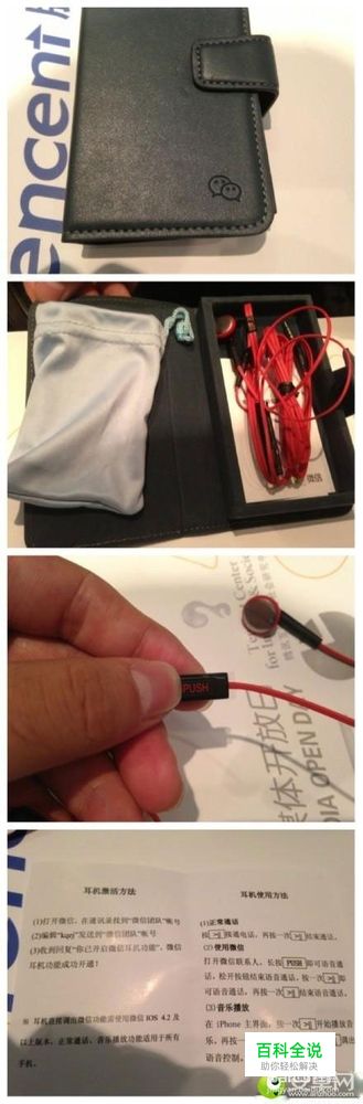 腾讯之前推出的 微信定制耳机,还没有直接上市销售,只是以礼品的形式发放,在腾讯大会上再次向现场发放微信定制耳机。 那微信定制耳机与普通耳机有什么区别呢? 微信定制耳机出了除了通话按键、音量按键外,还增加了一个“Push”键,长按即可接受发送语音消息。 根据说明书显示,微信定制耳机使用之前需要激活,用户需要编辑“kqer”发送给“微信团队”微信帐号,收到回复后可启用。 目前,微信功能只能适用于iOS 4.2及以上版本,还不支持Android设备。音乐播放功能适用于所有手机。