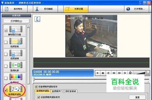 左侧一排显示的效果列表,里面有各式各样的功能,其中一项就是“音频噪声滤除”,打勾再选中此项功能,右侧下部就会出现“设音频噪音滤除有效”前面打勾,再进行参数的调节,进行试听,一直到效果满意为止,最后确定按钮。