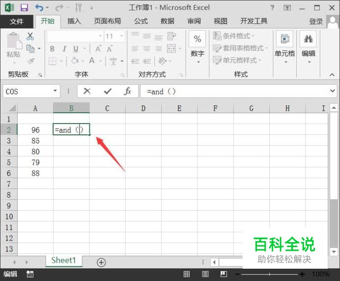 输入AND函数之后在括号内输入数据所在的单元格,如图所示: