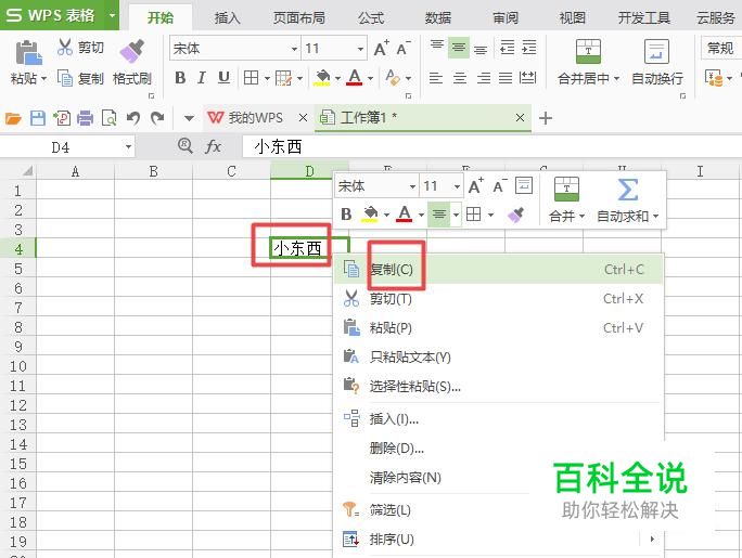 然后我们选中这个文字的单元格,弹出的界面,我们点击复制;