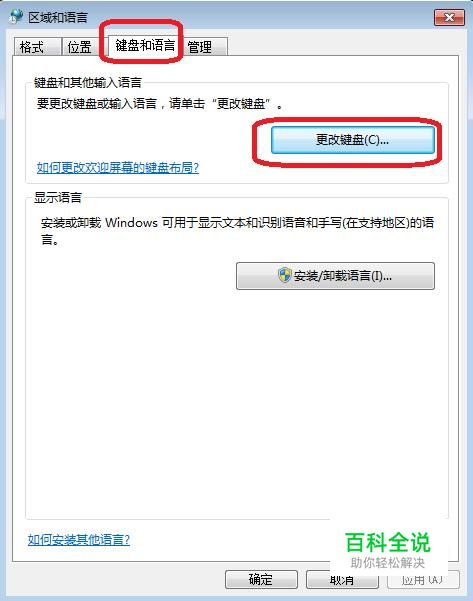 在弹出的“区域和语言”选项框中,我们点击“键盘和语言”标签,在其下点击“更改键盘”。