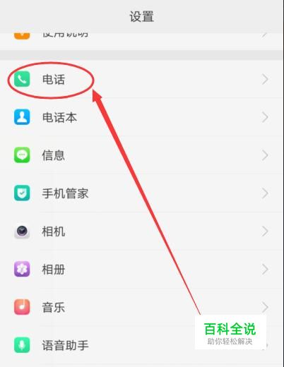 在设置页面,找到“电话”选项,点击并进入,如图所示。