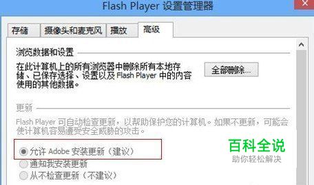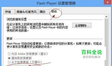 一:首先进入Win8控制面板,然后找到“Flash Player设置管理器”,然后切换到“高级”选项卡,再点击下面的“更改更新设置”,如下图: