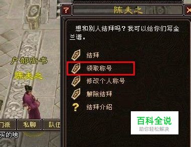 获得称号: 结拜完成后,所有结拜的玩家组成一队,由队长和洛阳的陈夫之(144,68)对话,选择“领取结拜称号”,队长交付5金(优先扣除交子)后,输入一个合法的称号后即成功。