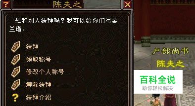 接纳新成员: 玩家结拜人数少于6人时,可以在结拜后随时接纳满足结拜条件的新成员。由原结拜玩家与新加入的玩家一起组队,队长与洛阳的陈夫之(144,68)对话,选择“义结金兰”后即可。