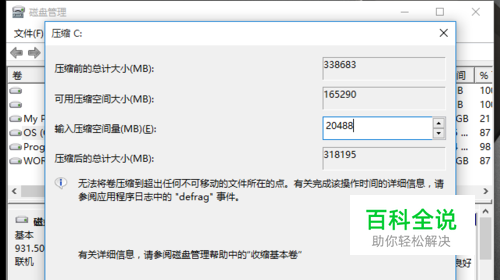 大小选择,压缩1024M=1G,想要压缩20G的分区出来,就20480M