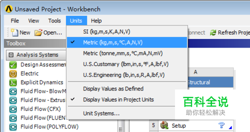 打开ANSYS workbench软件,设置单位制为metric。 调用静态模型分析static structure模块(本文是准备进行静态非线性分析,模块选用可以根据具体情况决定)。