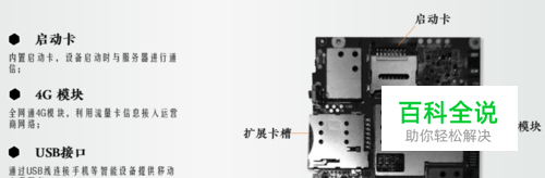 硬件结构: 1、启动卡,内置启动卡,设备启动时与服务器进行通信; 2、4G 模块,全网通4G模块,利用流量卡信息接入运营商网络; 3、USB接口,通过USB线连接手机等智能设备提供移动电源服务; 4、扩展卡槽,本地扩展卡槽,可选插本地流量卡,提供WiFi服务;