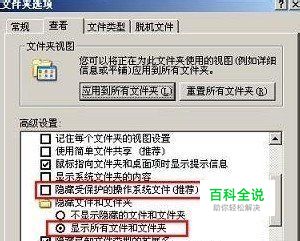打开“我的电脑”——>点击上方的“工具”菜单—— >选择“文件夹选项”——>点击“查看”——>将下方“高级设置”中的“隐藏受保护的操作系统文件(推荐)”前面的勾去掉——> 再勾选中“显示所有文件和文件夹”——>点击“确定”退出 如下图: