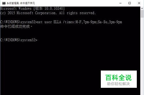 打开「命令提示符(系统管理员)」输入 net user 用户名 /times:M-F,7pm-9pm;Sa-Su,3pm-9pm 后,按键盘[ Enter ]键,便可限定“用户名”(替换成实际的本地账户名称)在星期一到五下午 7-9点,星期六、日下午3-9点可以使用自己的账号登入。