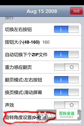用什么软件看漫画? 首先是看漫画的软件,我推荐的是 iComic-v1.1,因为我也没用过别的软件(实话)。 这里关于icomic的用法我只想补充一点论坛里没有的,就是关于锁定重力感应。因为很多人喜欢躺着看漫画,所以必须锁定重力感应。但是icomic的设置里并没有这一项,很多人以为没有这个功能。其实是可以锁定的,只要点击设置——>旋转角度——>输入0-4的值,就可以锁定在相应角度,我用的是3。不明白的看图: