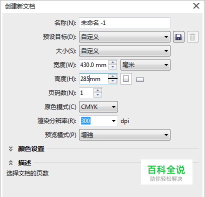 1.新建一文档 宽430mm 高度285mm 颜色模式:cmyk;分辨率 300 设置完点确定。