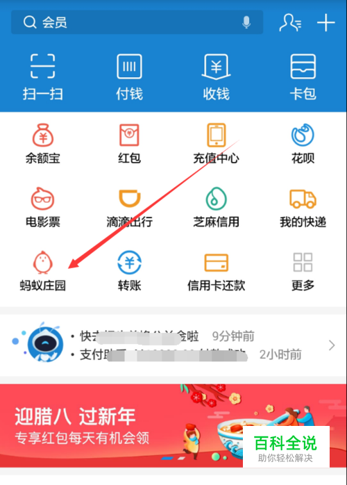 打开手机支付宝软件,然后点击首界面里的【蚂蚁庄园】,如下图所示。