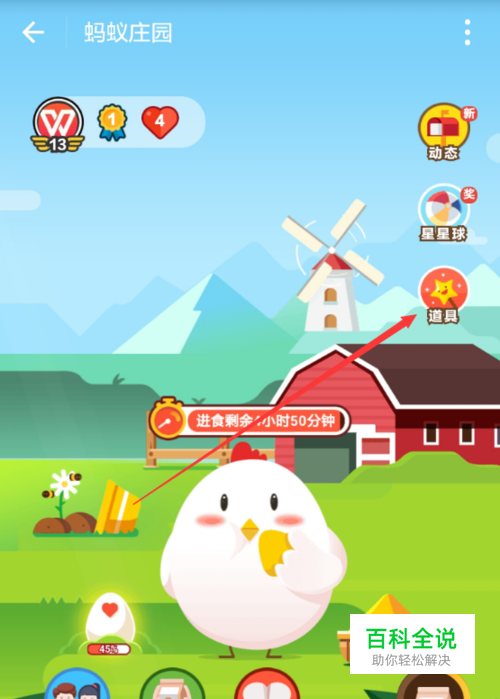 在支付宝蚂蚁庄园界面里直接点击右侧的【道具】,如下图所示。
