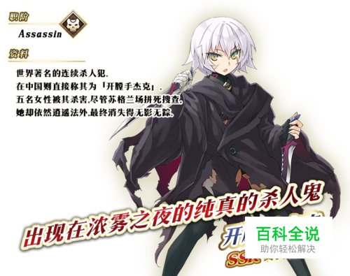 开膛手杰克 编号:75 职阶:Assassin 稀有度:SSR 属性:混沌·恶