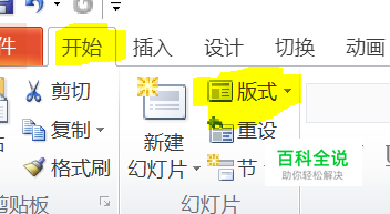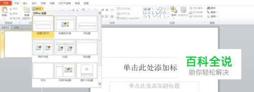 如图中的一张幻灯片,单击“开始”选项卡下的“幻灯片”组中的“版式”下拉按钮,将其改为“标题”幻灯片。