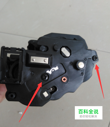 首先用十字螺丝刀将硒鼓右侧的两颗螺丝拧掉,如图所示: