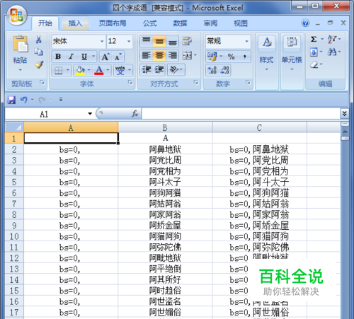 首先我们打开一份已经输入文字的表格,【比如:四个字成语】。